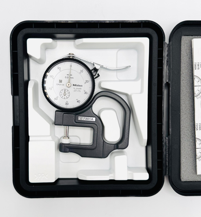 این ضخامتسنج از سری ۷ برند Mitutoyo با مدل 7301A، دارای آنویل و اسپایندل سرامیکی است که مقاومت بیشتری در برابر فرسایش و سایش دارد. محدوده اندازهگیری آن ۰ تا ۱۰ میلیمتر با تفکیکپذیری ۰٫۰۱ میلیمتر است و دقت مجاز حدود ±۰٫۰۱۵ میلیمتر بهصورت استاندارد ارائه شده است. نیروی اندازهگیری کم (حدود ۱٫۴ نیوتن یا کمتر) سبب میشود که روی نمونههای نازک یا حساس، فشار کمتر وارد شود و اندازهگیری دقیقتر انجام گیرد.